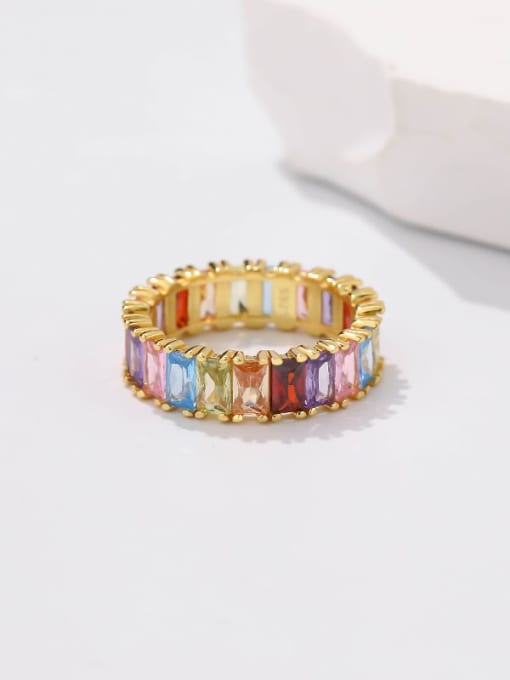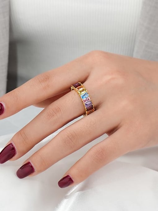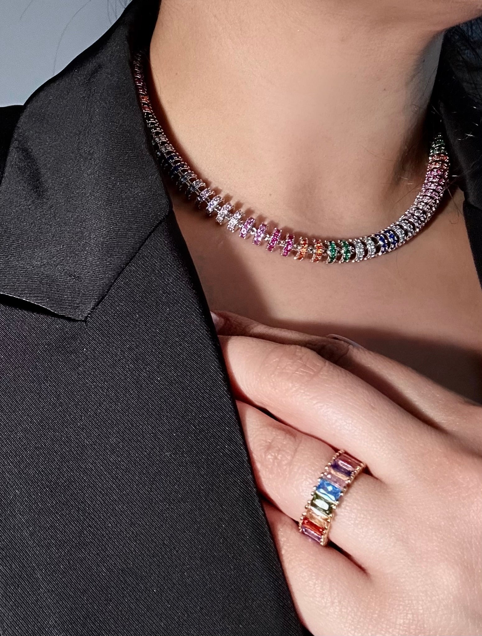 This rainbow baguette ring is a unique twist on a classic design. The vibrant colors and sparkling details make it a statement piece that will add a pop of joy to any outfit. Stand out from the crowd and express your individuality with this eye-catching ring!
