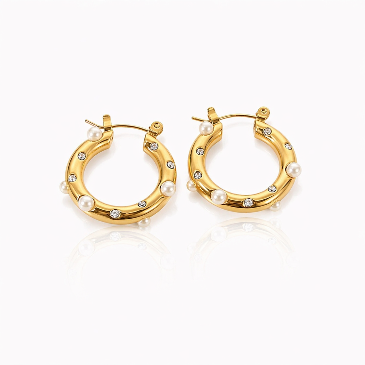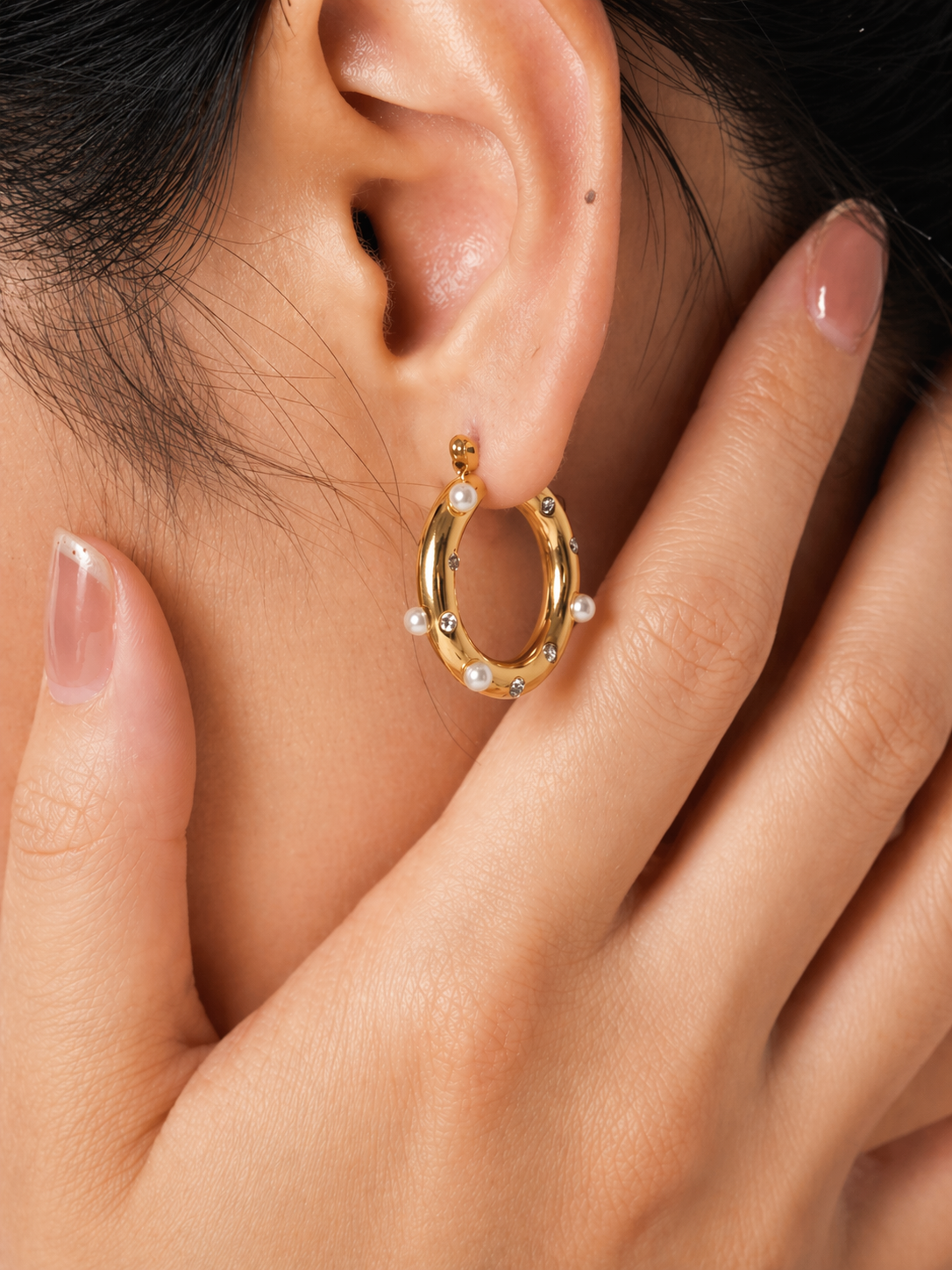 Etude hoops capture understated elegance with luminous white shell pearls suspended in 18K goldplated stainless steel. At 26mm x 24mm, they strike the perfect balance between presence and wearability—substantial enough to make a statement, refined enough for everyday luxury.The warm gold finish complements the soft iridescence of the pearls, creating a piece that transitions effortlessly from day to evening. Limited edition.